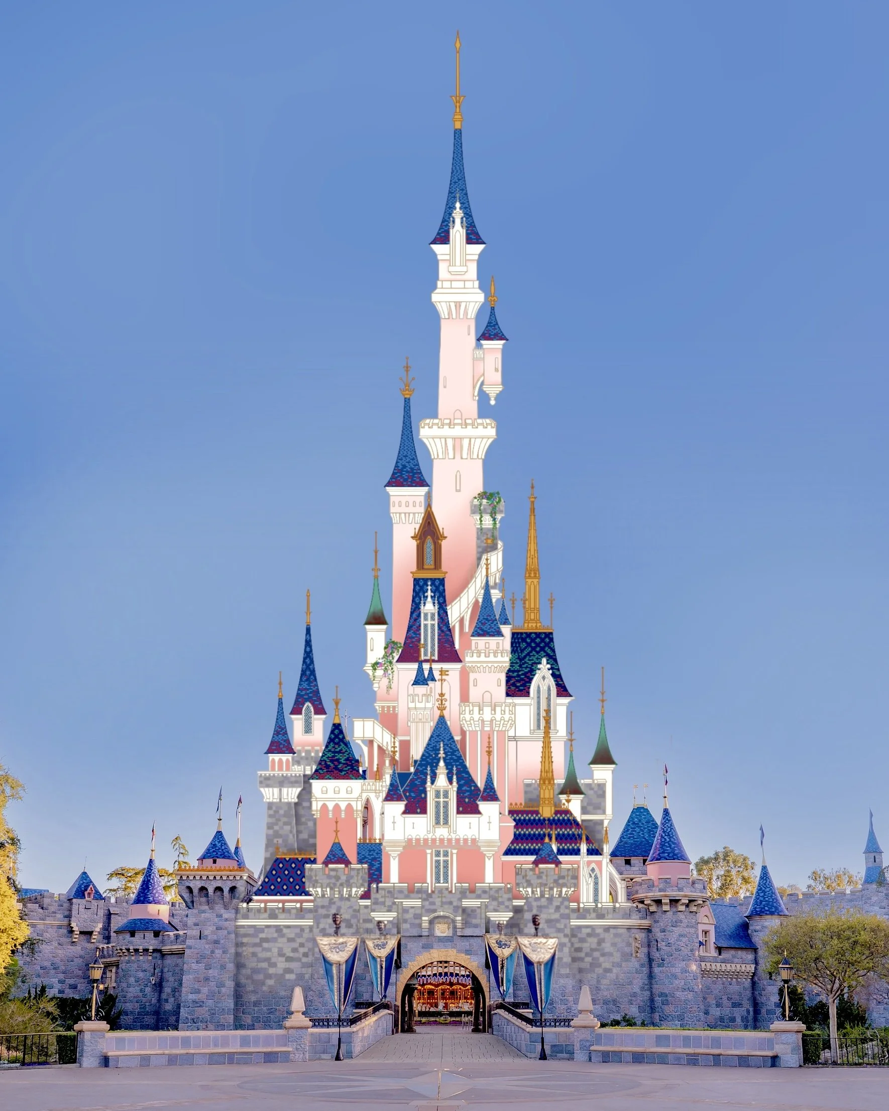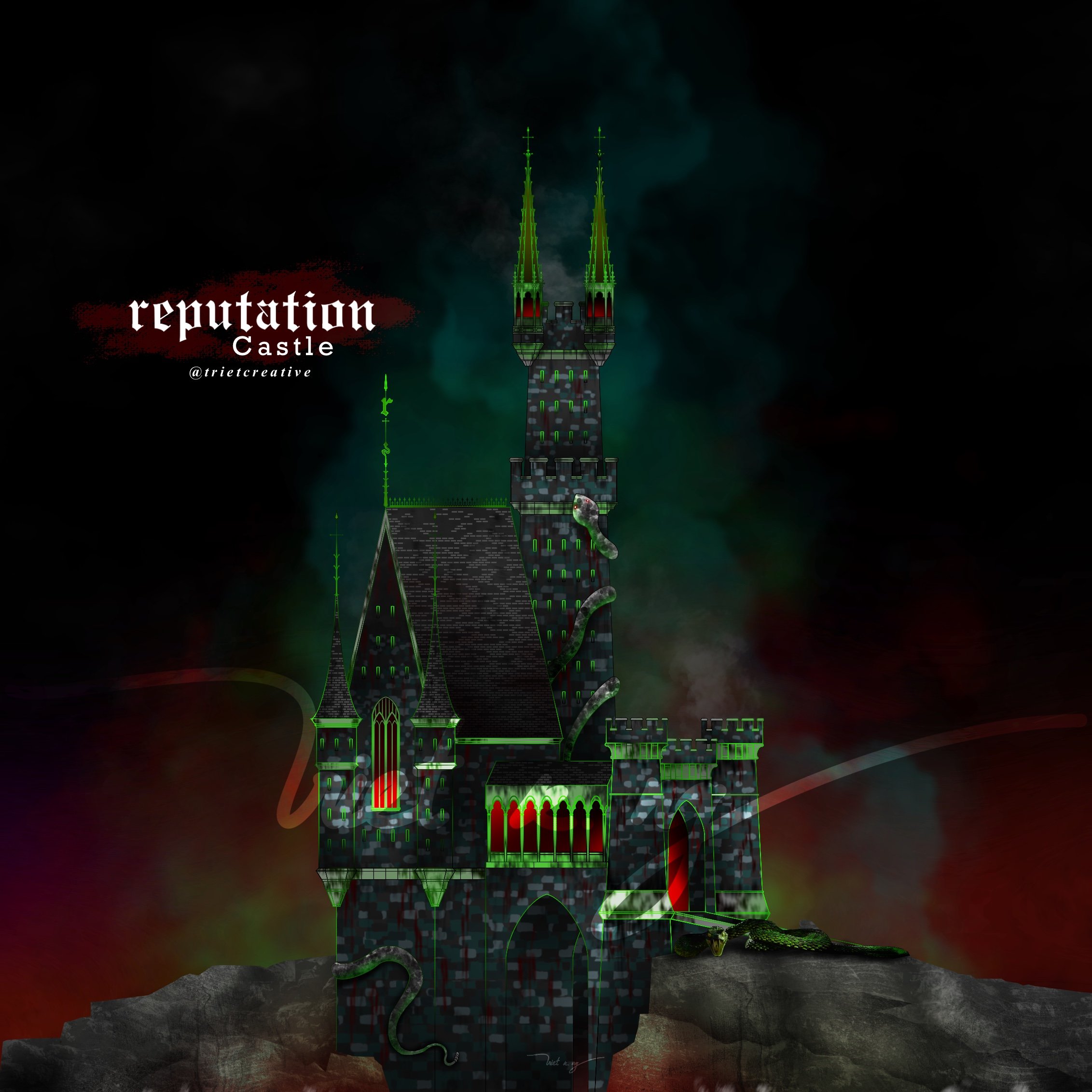 Metallic sculpture, spray paint, LED lights, and fog
